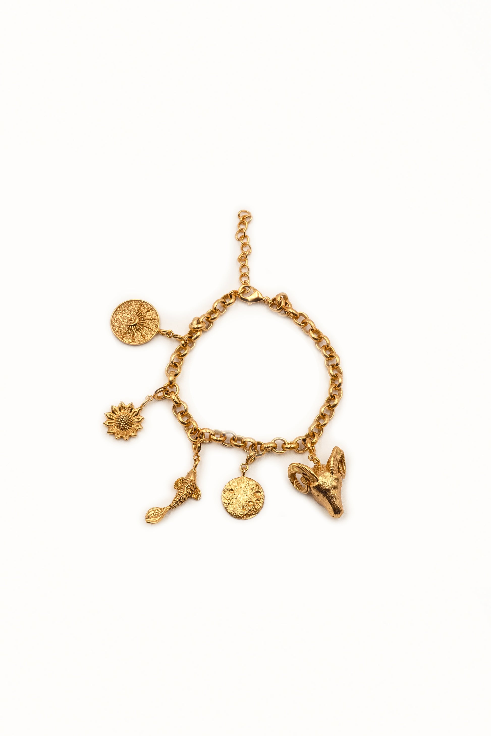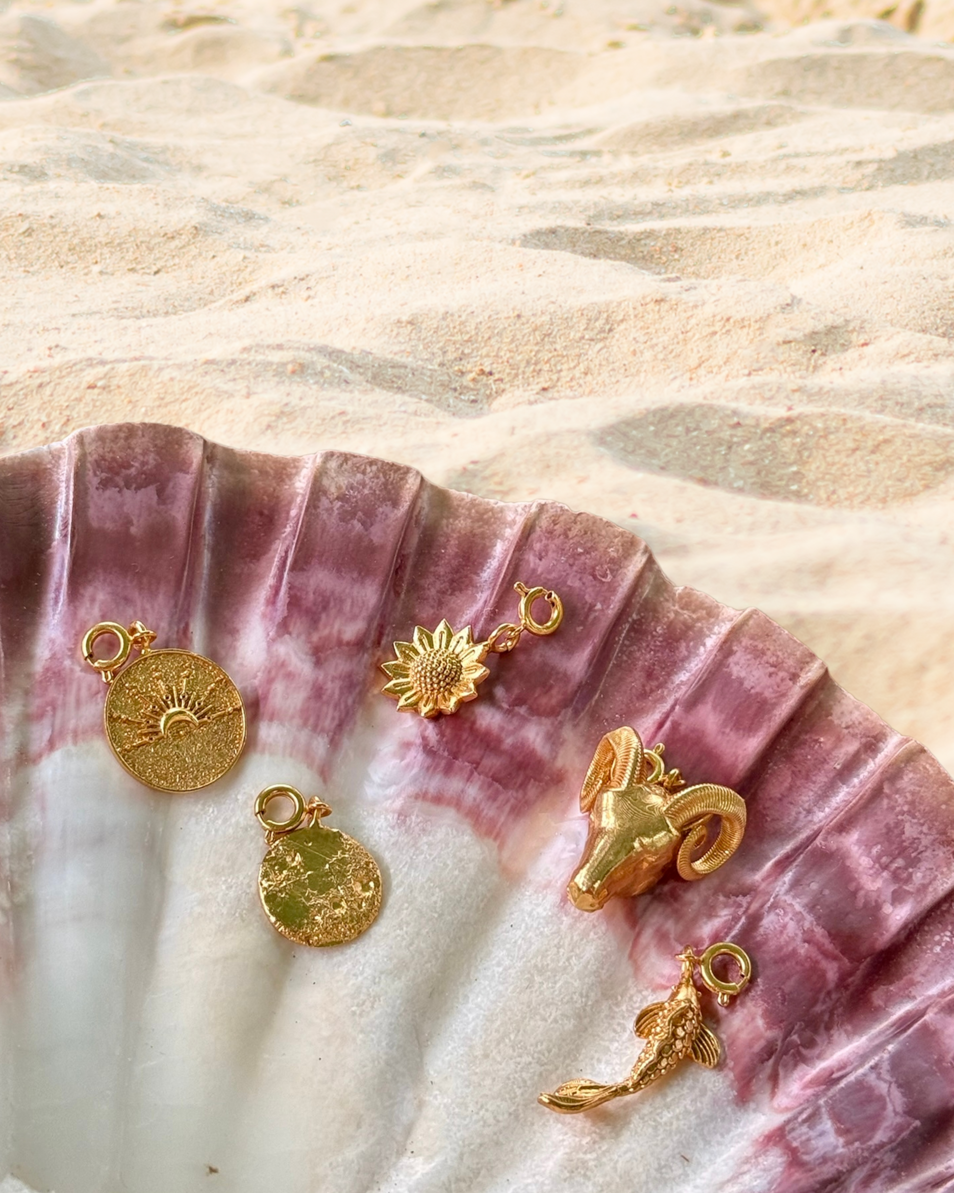 Inspired by the sleek cable chain, the Charmscape Bracelet is paired with Saka’s signature charms—Bighorn, Sunflower, Moon, Logo, and Koi Fish—for a fully customizable piece. Wear it with all the charms for a bold look or switch them up for subtle styling. .
