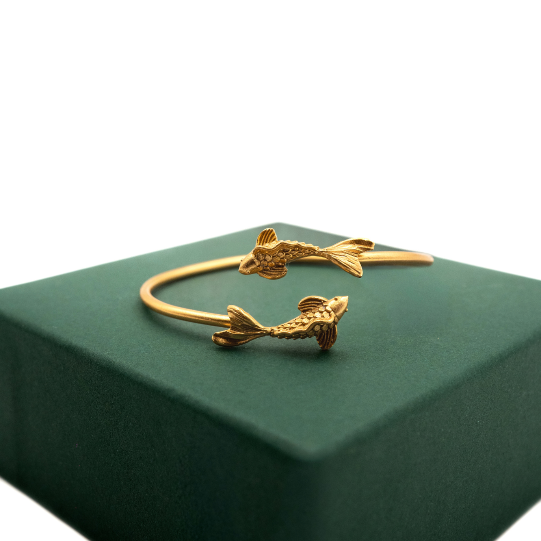 Delicately designed with two tiny koi swimming toward each other, this adjustable wrist cuff embodies harmony, balance, and the symbolic elegance of the koi. A subtle yet meaningful statement piece.