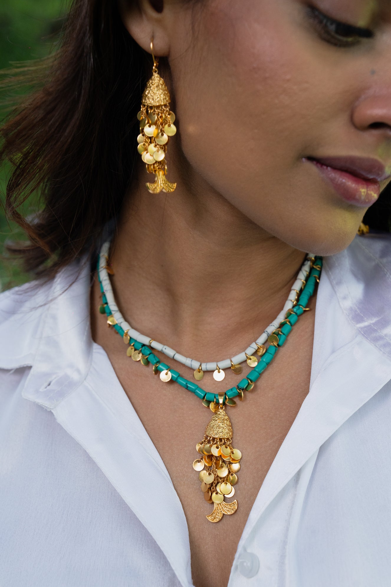A striking play on form and texture, the Siren Scale Necklace features a cascading fish design where coins mimic shimmering scales. This unique piece captures movement and elegance, perfect for adding a bold, contemporary touch to any outfit.